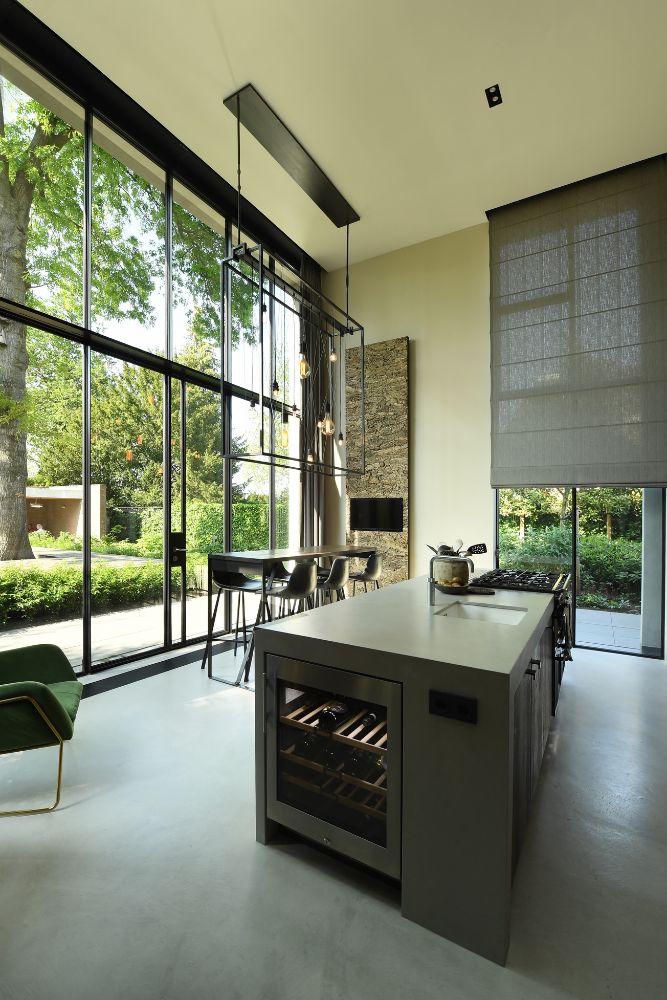 Het natuurlijk licht dat door deze enorme glaspartij naar binnen stroomt, vormt een essentieel onderdeel van het interieurconcept, dat werd uitgewerkt door AOZ interieur. Licht en ruimte zijn hier niet alleen visueel belangrijk, maar spelen ook een functionele rol in de beleving van het huis.