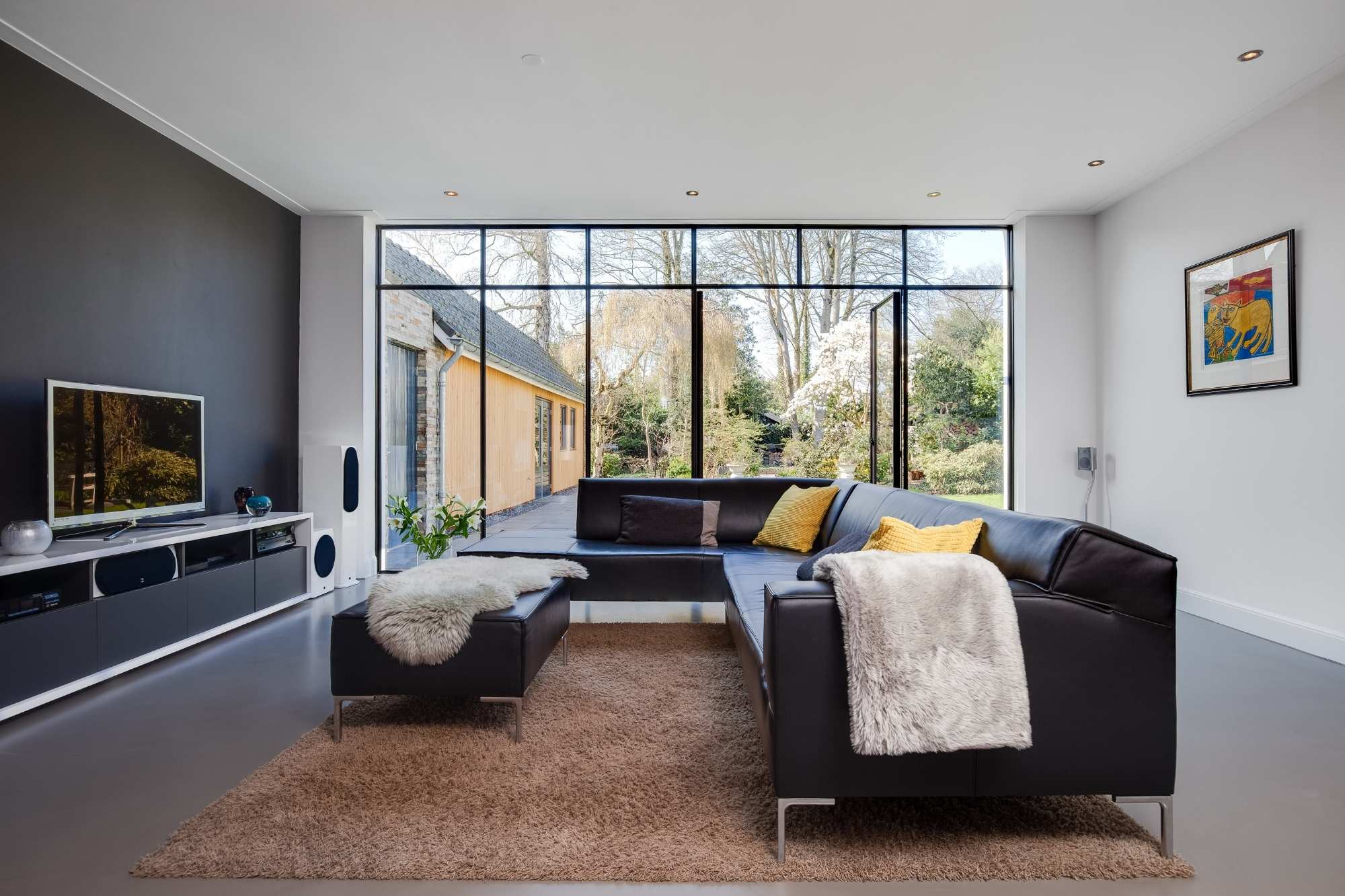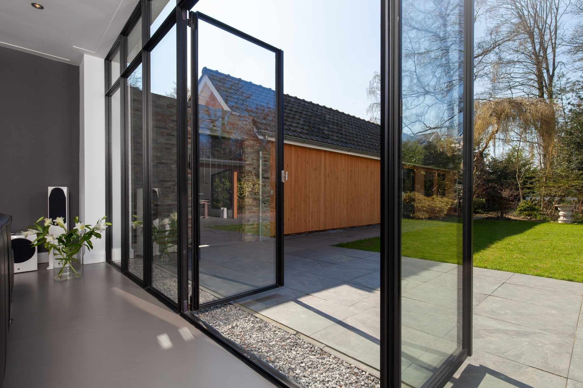 De toegepaste MHB pui is voorzien van een dubbel openslaande stalen tuindeur die volledig geopend kan worden tot 180 graden. Hierdoor ontstaat een royale verbinding met de tuin. In gesloten stand vloeien de deuren naadloos samen met de vaste kozijndelen en zijn ze nauwelijks te onderscheiden. De slanke profielen zorgen voor maximale lichtinval in de woonkamer en behouden het open karakter van de ruimte.