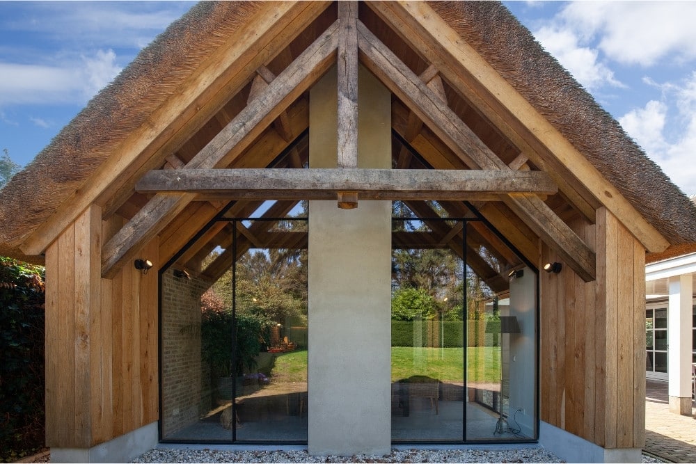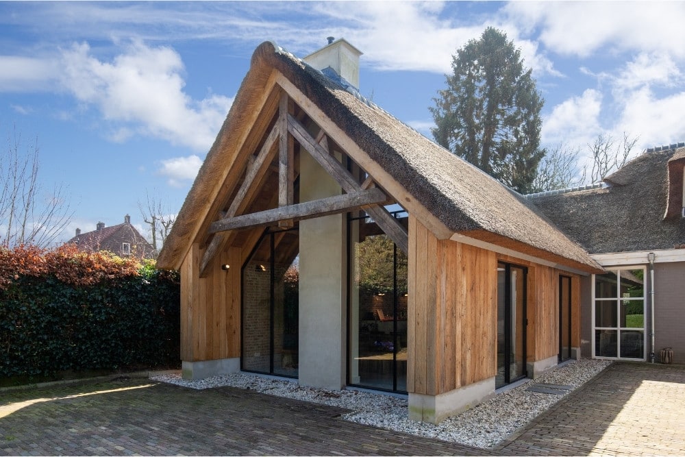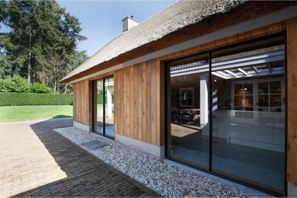 In het Gelderse Oosterbeek is een woning gerealiseerd waarin traditionele materialen en moderne architectuur elkaar versterken. De houten gebinten, het rieten dak en de gemetselde binnenmuur vormen een warm kader waar het fijn stalen raamwerk van MHB moeiteloos in opgaat. De combinatie van robuuste constructie en verfijnde detaillering creëert een woning die rust uitstraalt, maar tegelijk eigentijds aanvoelt.