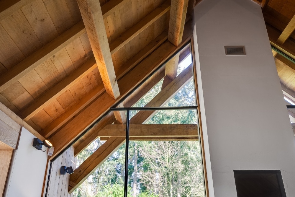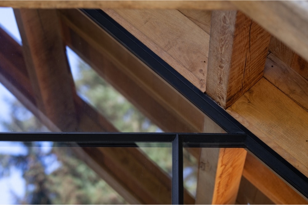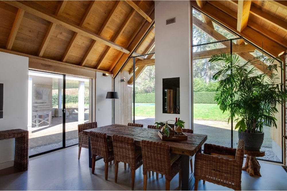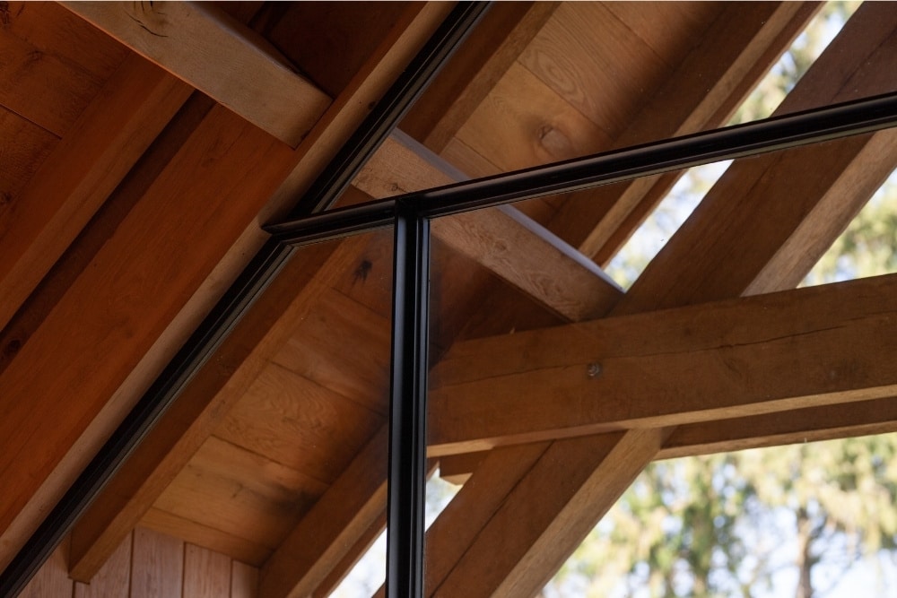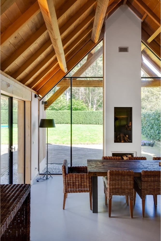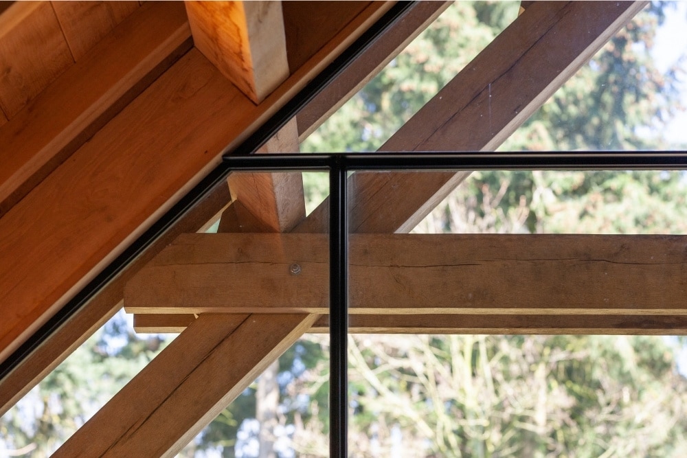 Het daglicht speelt een belangrijke rol in dit ontwerp. De grote glasvlakken vangen het buitenlicht en verdelen het gelijkmatig over de ruimte, terwijl de stalen profielen de lijnen van het interieur accentueren. Zo ontstaat een spel tussen openheid en geborgenheid. De gekozen afwerking sluit perfect aan op de natuurlijke materialen en zorgt voor een zachte overgang tussen binnen en buiten.