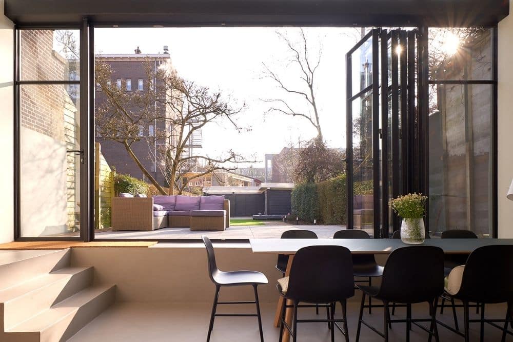 Om de overgang tussen de keuken en het terras te minimaliseren is gekozen voor een stalen harmonicapui. Deze MHB stalen schuifwand heeft een totale breedte van vijf meter en kan volledig worden geopend. Hierdoor ontstaat een directe verbinding met de tuin, waarbij binnen en buiten moeiteloos in elkaar overvloeien. In gesloten stand blijft het gevelbeeld rustig en transparant, zonder afbreuk te doen aan comfort of isolatie.