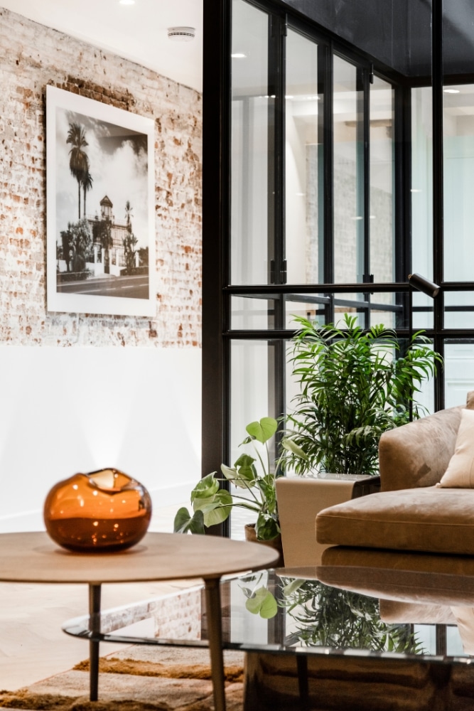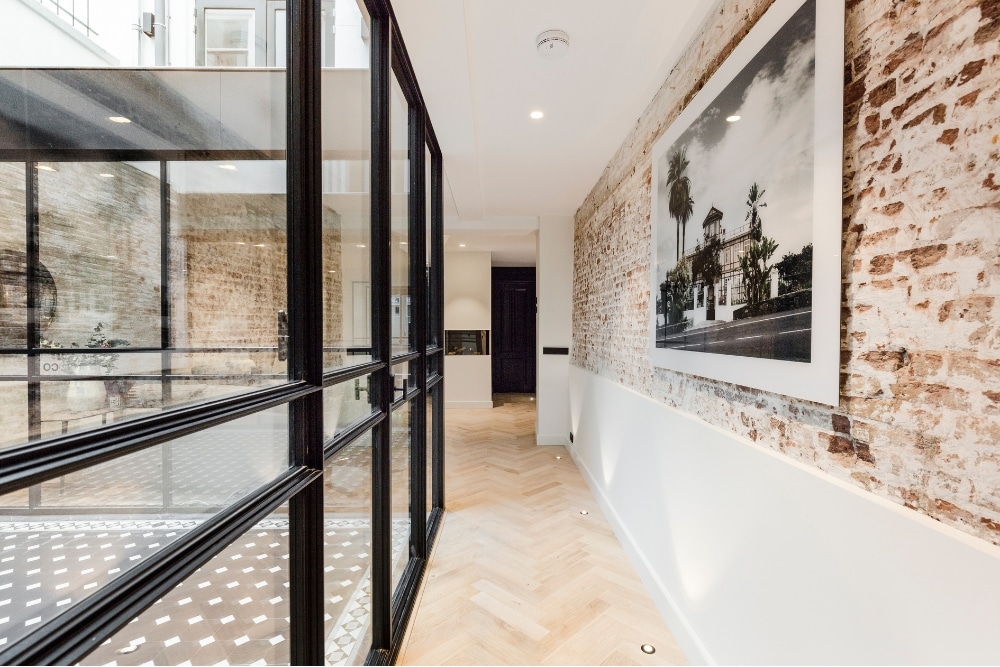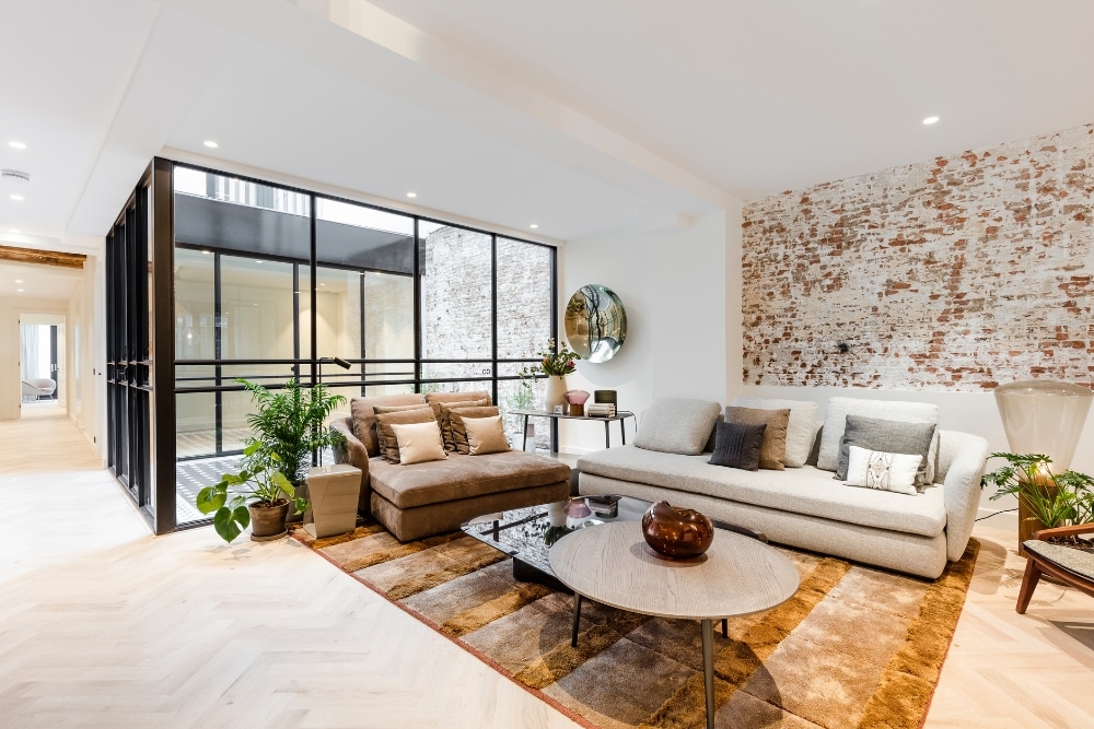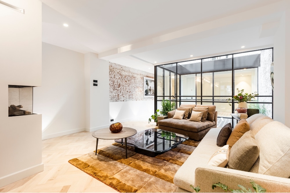 De combinatie van slanke stalen ramen, wit gepleisterde wanden en een met zorg behouden bakstenen muur geeft de woning een warme, eigentijdse uitstraling. Het staal is verfijnd toegepast en vormt een elegant contrast binnen het heldere interieur. Dankzij de minimalistische profilering blijven zichtlijnen open en worden licht en ruimte optimaal benut.