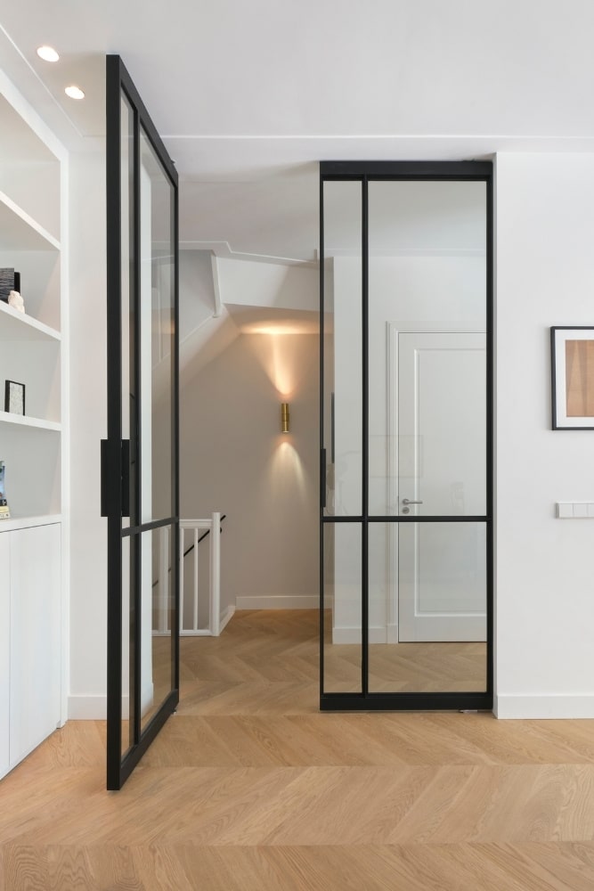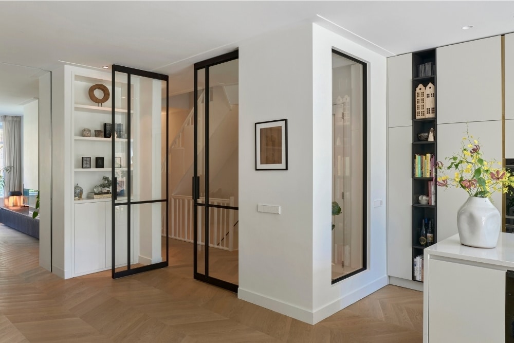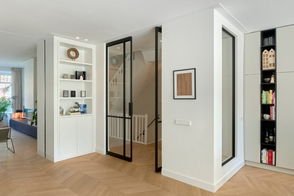 Naast de stalen buitenpui in de achtergevel zijn ook de massief stalen binnenkozijnen door Perfect View Windows gemonteerd. De uitstraling van de profielen is exact gelijk aan de buitenkozijnen. Het vaste raam naar de gang toe zorgt ervoor dat het licht van buiten wordt doorgetrokken. De toegang naar de gang wordt verzorgt door dubbele taatsdeuren. De taatsscharnieren worden verwerkt in de deuren. Hierdoor hoeft er geen sloopwerk verricht te worden aan de vloer. Deze deuren zijn zeer gebruiksvriendelijk en kunnen open blijven staan in een 90 graden stand.