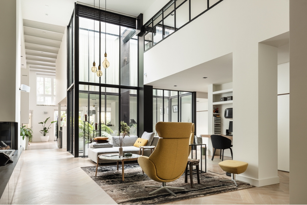 De hoge plafonds dragen bij aan een gevoel van ruimte en grandeur. In combinatie met het staal en glas ontstaat er een interieur waarin rust, ritme en licht centraal staan. De toegepaste kozijnen sluiten naadloos aan op het ingetogen materiaalgebruik en brengen het daglicht tot diep in de woning.