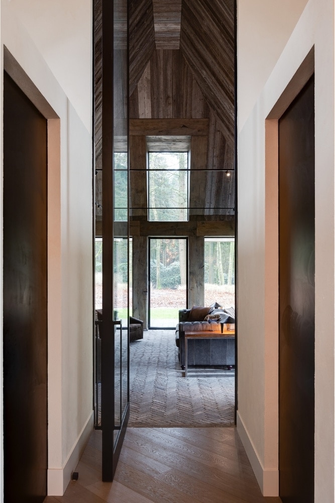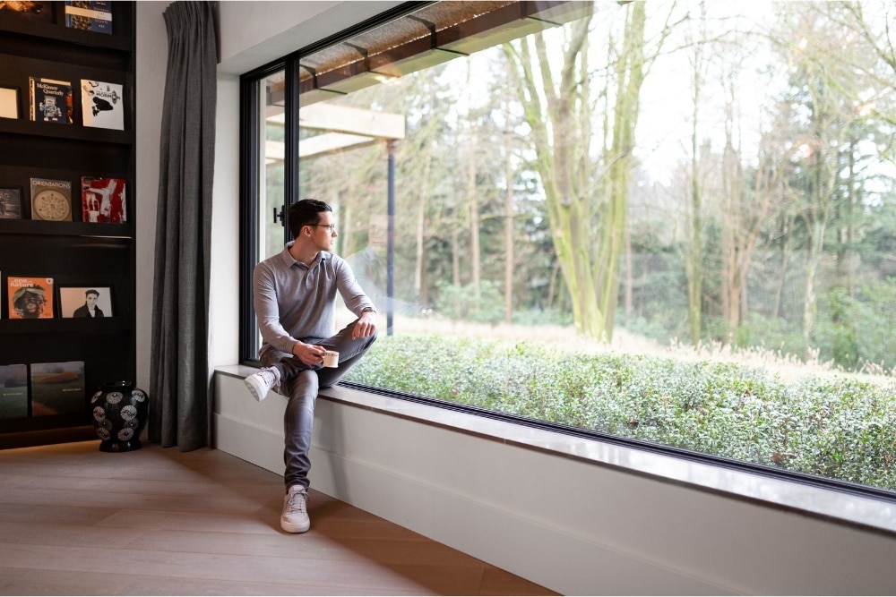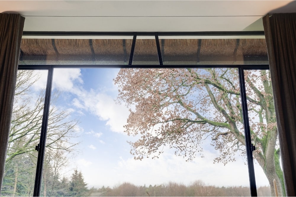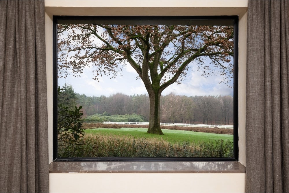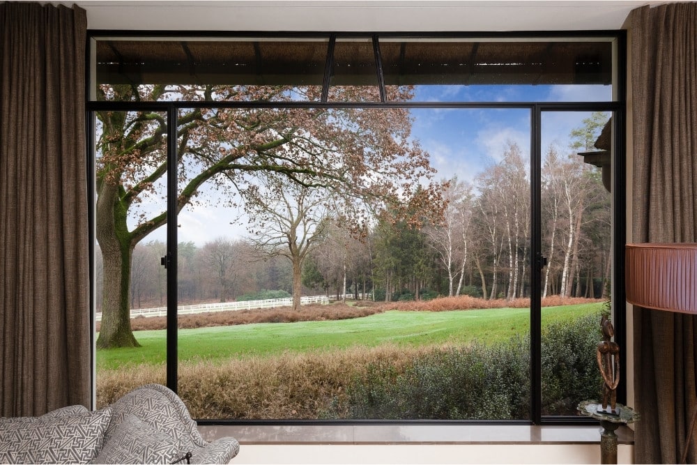 De toepassing van minimalistische MHB stalen ramen geeft het huis een nieuwe openheid. Slanke profielen zorgen voor maximale transparantie en vangen iedere lichtstraal. Sommige raampartijen ogen als schilderijen: herfstbladeren, takken en wolken vormen levende composities, gezien door het glas. Dit effect is puur natuur, zonder trucage, en benadrukt hoe architectuur en omgeving elkaar hier versterken.