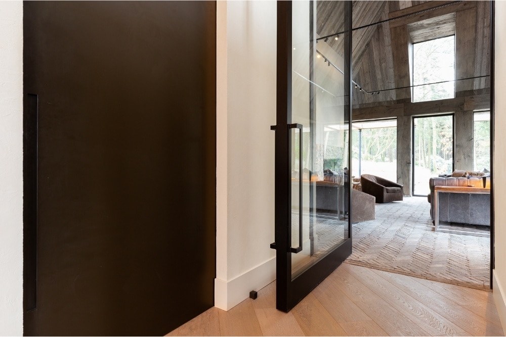 Een absolute blikvanger in dit project is de stalen taatsdeur van maar liefst vijf meter hoog. Uniek in schaal en uitvoering, maar tegelijkertijd ingetogen en verfijnd. Het is ongekend dat een element van dit formaat zo naadloos in het ontwerp past, zonder te overheersen of storend aanwezig te zijn. De deur versterkt de grandeur van het jachthuis en laat zien waartoe maatwerk in staal in staat is.