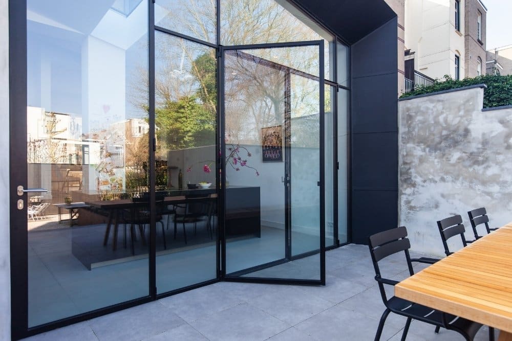 Wat dit ontwerp bijzonder maakt, is de asymmetrie. De toegangsdeur is hoger dan de dubbele tuindeur en voorzien van een verbrede sluitstijl. Dit geeft niet alleen karakter aan de gevel, maar benadrukt ook het maatwerk van het systeem. Aan de bovenzijde is het glas nog doorgetrokken om de hoek, waardoor ook vanaf die zijde licht diep de woning binnenvalt.