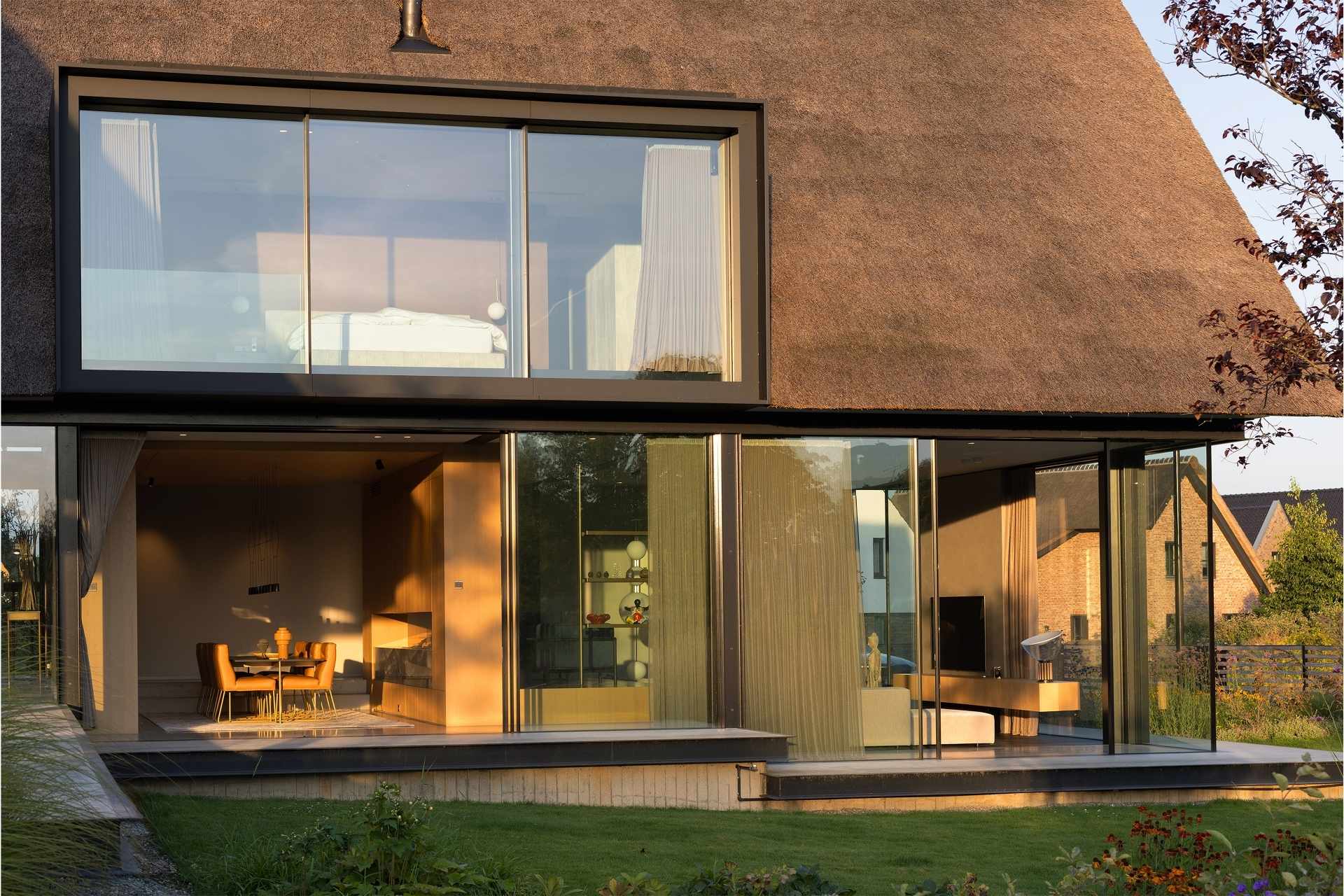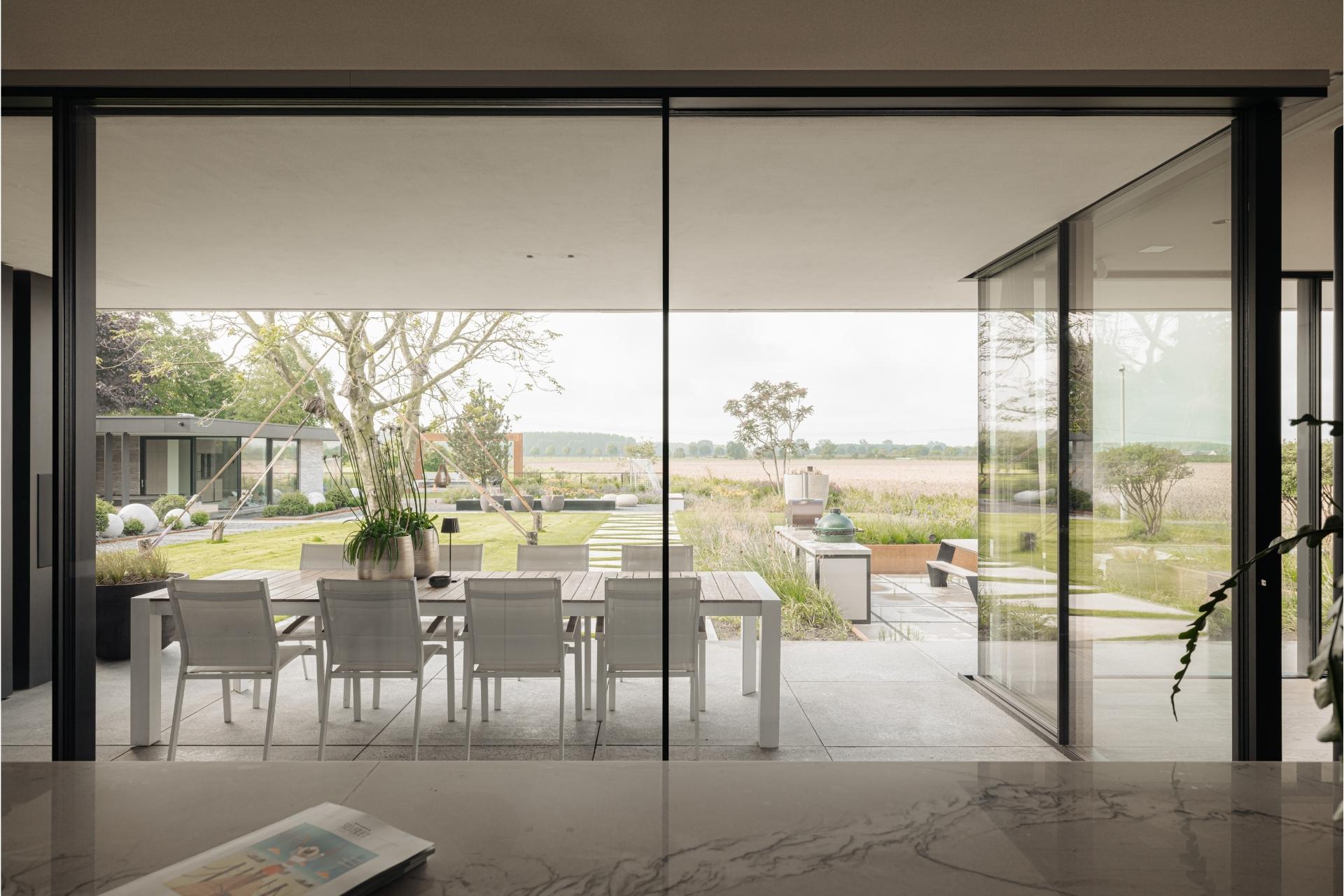 Een strak aluminium frame met een minimalistische uitstraling dat naadloos aansluit bij moderne architectuur. Het systeem biedt veelzijdige openingen (zijwaarts, centraal of hoek) en rails die volledig vlak zijn met vloer en plafond voor een vloeiende overgang tussen binnen en buiten.